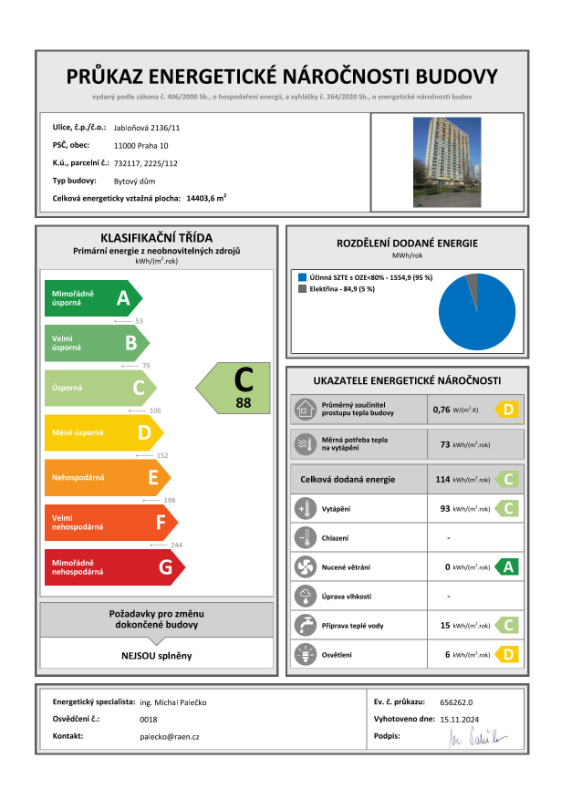 Arnika_Energeticky-stitek-budovy.jpg - doporučená opatření, podíl energonositelů na dodané energii a ukazatele energetické náročnosti budovy. (JPG, 166 kB)